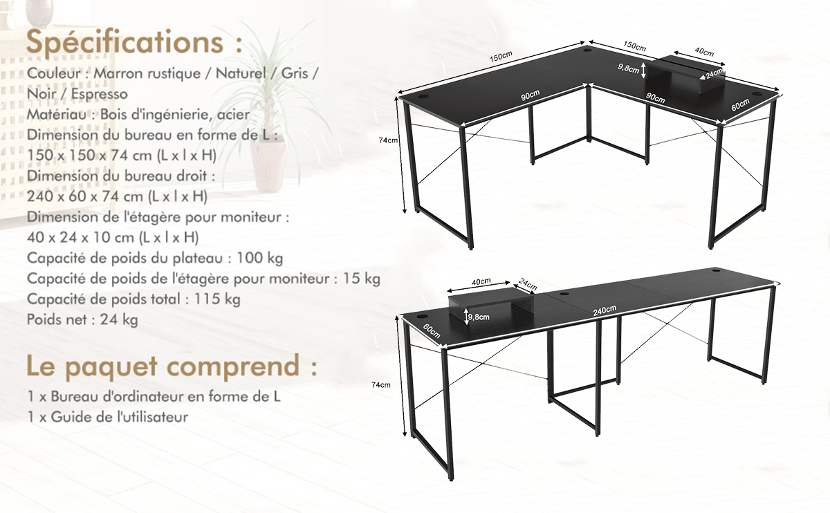 【Conception convertible: 】2 formes de bureau:le bureau en forme de ‘l' de 150 x 150 x 74 cm peut être transformé en celui de 240 x 60 x 74 cm de long. Et quelle que soit la forme, le bureau réversible offre un grand espace pour que 2 personnes puissent travailler en même temps.