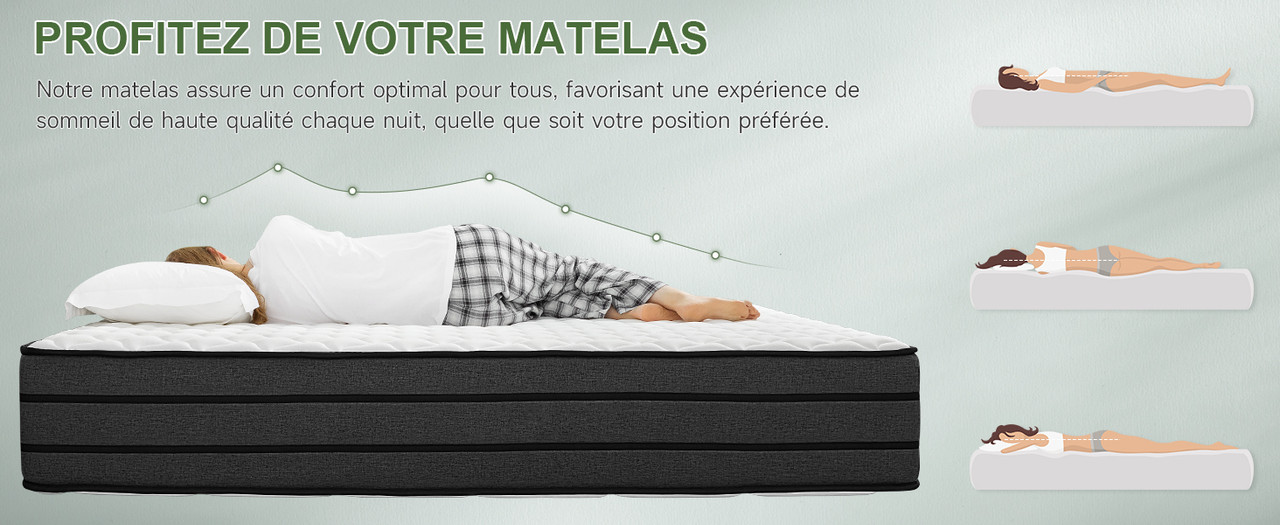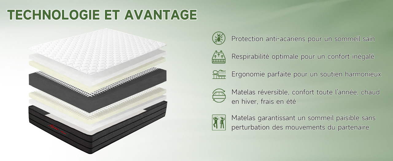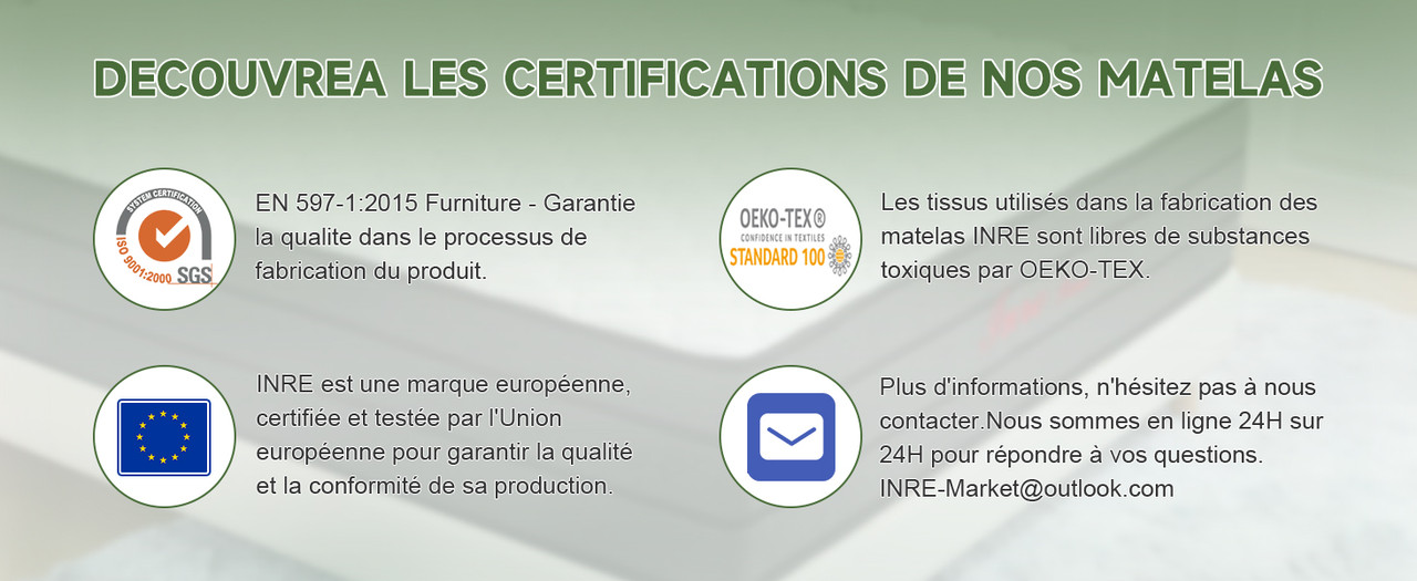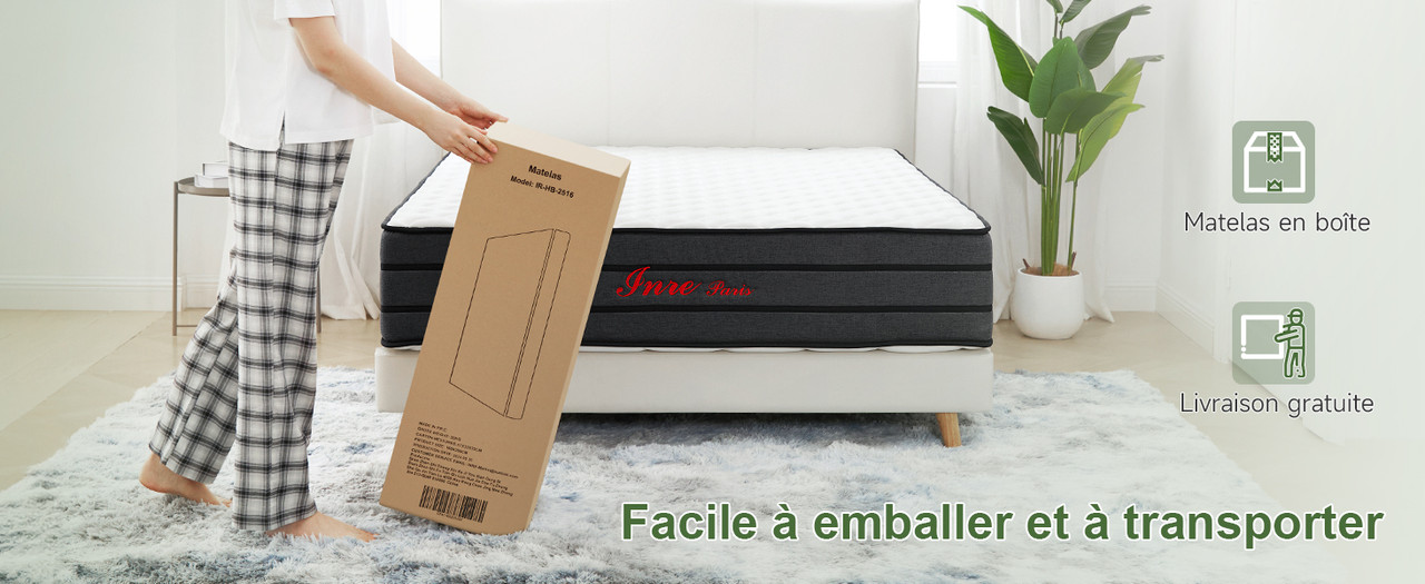Le matelas INRE est conçu pour un confort optimal lors du sommeil. Les 7 zones de soutien garantissent une répartition équilibrée du poids, permettant un sommeil réparateur. Il convient à toutes les positions de sommeil, que ce soit sur le dos, le ventre ou le côté.