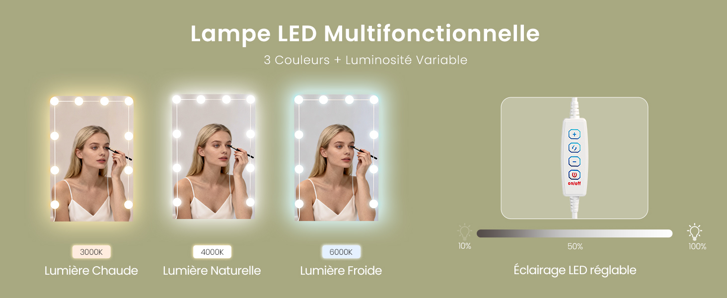L’écran HD offre des effets de réflexion nets et ravive le teint. Cette coiffeuse est équipée de 10 LED enveloppantes qui réfléchissent la lumière sous différents angles, offrant un éclairage uniforme et doux. 3 couleurs et luminosité sont réglables, permettent de trouver les conditions d’éclairage les plus adaptées. Profitez d’une expérience de qualité professionnelle parfaite dans une maison confortable.