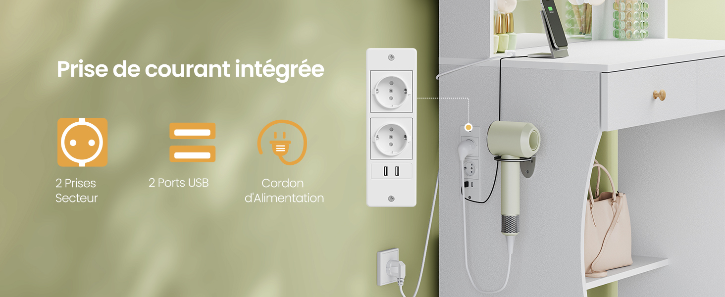 Cette coiffeuse dispose de 2 prises standard et de 2 ports USB, ce qui la rend plus pratique pour les fers à friser, les appareils de beauté, les sèche-cheveux et le chargement du téléphone. Une étagère supplémentaire offre un espace de rangement pratique pour votre sèche-cheveux, votre fer à friser et autres appareils. Une belle coiffeuse pour les vestiaires, les salons ou les retransmissions en direct.