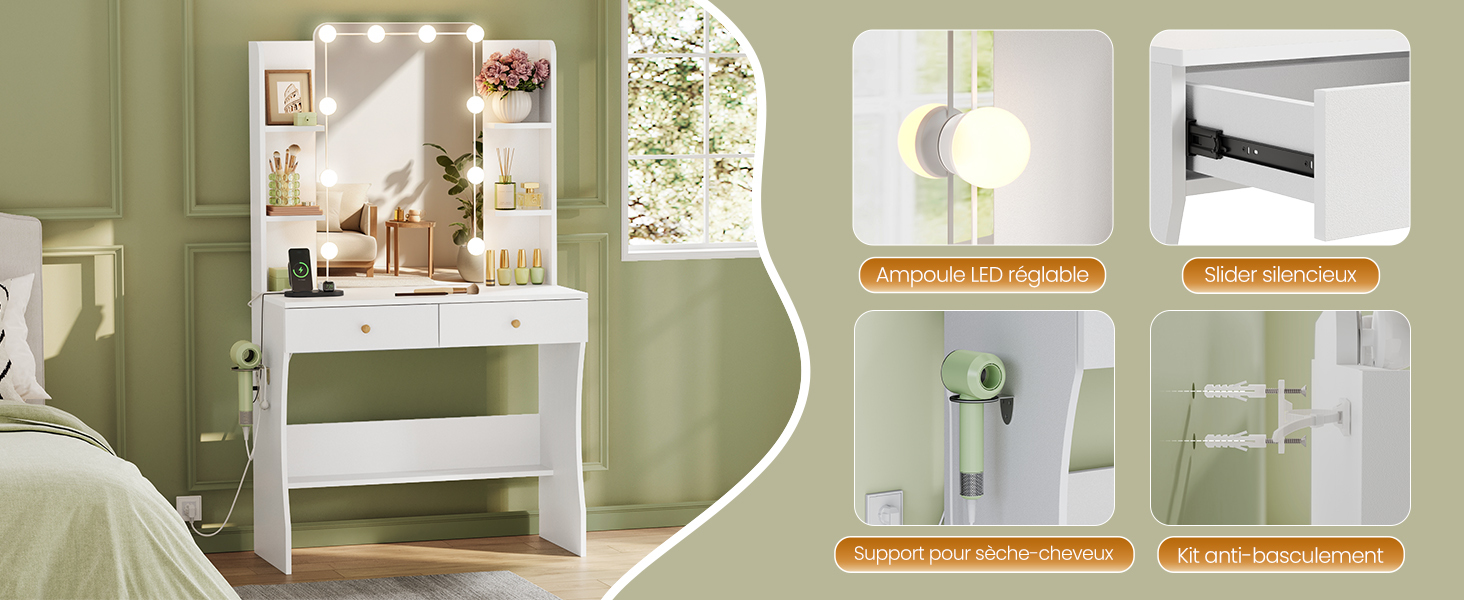 La coiffeuse HavenlyHome est fabriquée en panneaux de particules de haute qualité, qui présentent une excellente résistance et stabilité. Durable, facile à nettoyer et livré avec un dispositif anti-renversement pour augmenter la sécurité en fixant le bureau au mur. Les glissières de tiroir de haute qualité et fluides vous permettent d’ouvrir les tiroirs et d’en retirer ou d’y insérer des objets sans aucun problème.