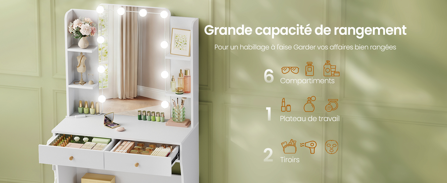 Cette coiffeuse offre un vaste espace de rangement avec 6 compartiments ouverts et 2 grand tiroir. Le compartiment permet d’accéder facilement à tous vos produits d’usage courant, tels que cosmétiques, produits de soin et parfums. Le tiroir inférieur permet de ranger des articles plus volumineux, comme des outils de coiffure ou des équipements de beauté, pour un rangement ordonné et organisé.