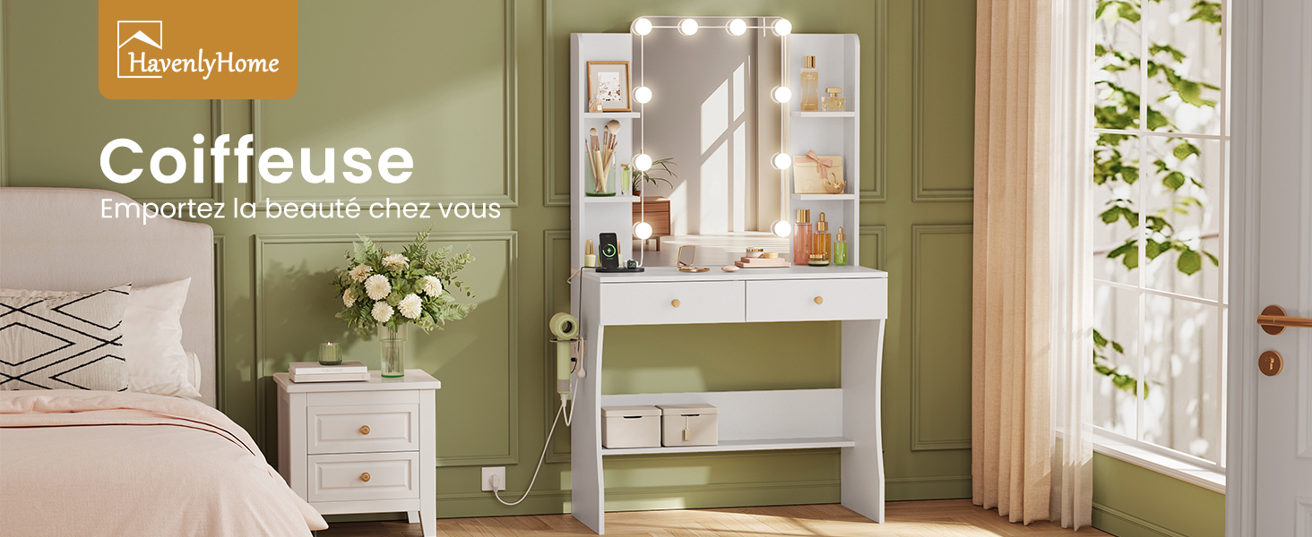 Découvrez la coiffeuse HavenlyHome, un mélange d’élégance et de praticité. Équipée d’un grand miroir entouré de 10 ampoules LED, elle offre un éclairage parfait pour votre routine beauté. Son généreux espace de rangement comprend 6 compartiments, 2 tiroirs et un plan de travail, le tout fabriqué en aggloméré de qualité pour une excellente durabilité.