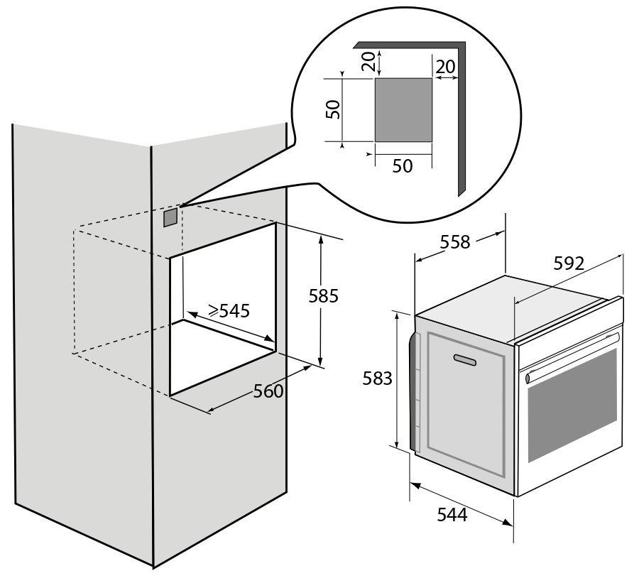 Avec des dimensions d'encastrement de longueur 56 cm, hauteur 58,5 cm et profondeur 55 cm, il s'adapte facilement à votre espace.