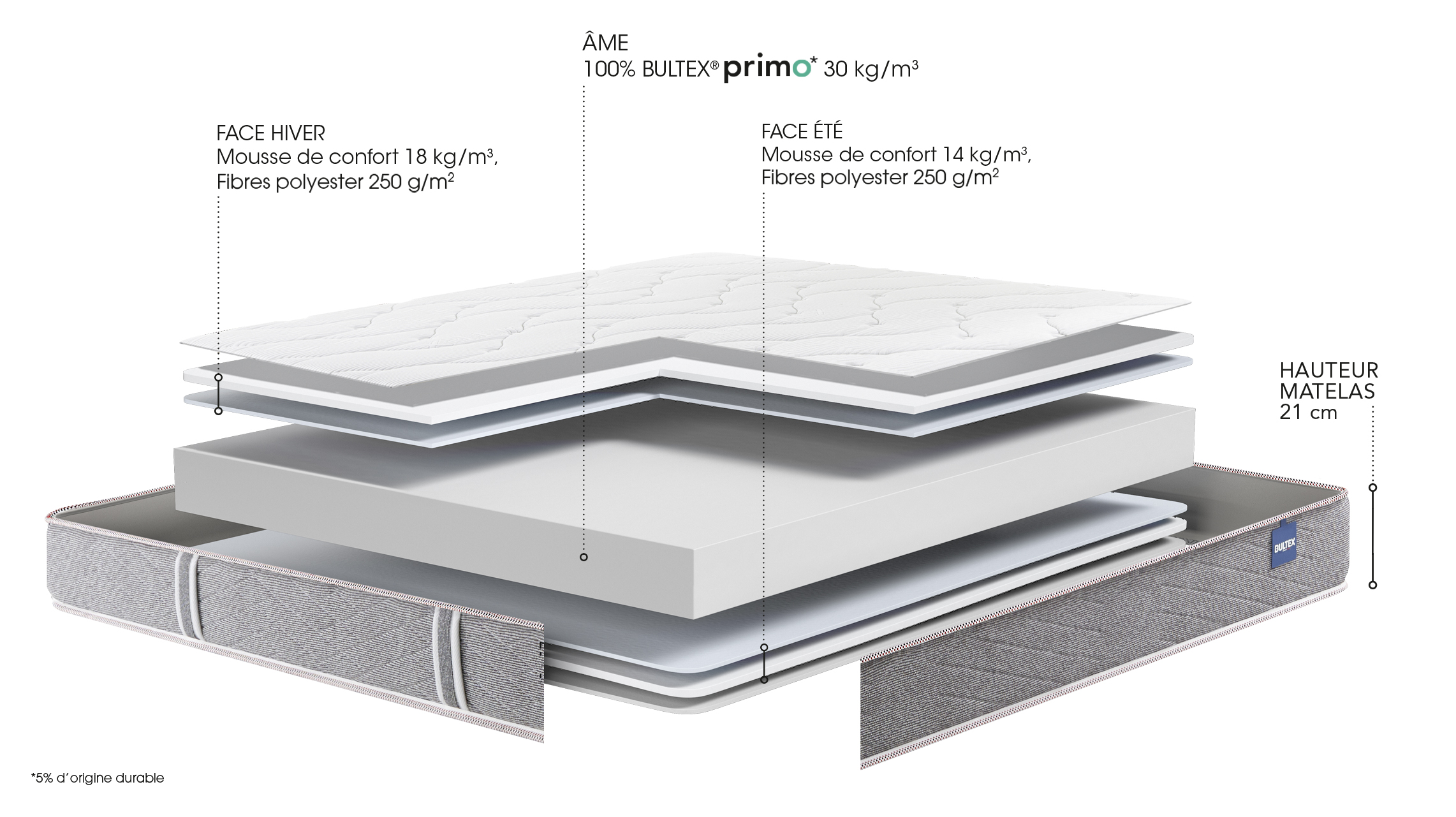 Avec une épaisseur totale de 21 cm, ce matelas garantit une ventilation optimale et un confort adapté à chaque saison grâce à ses faces été et hiver.