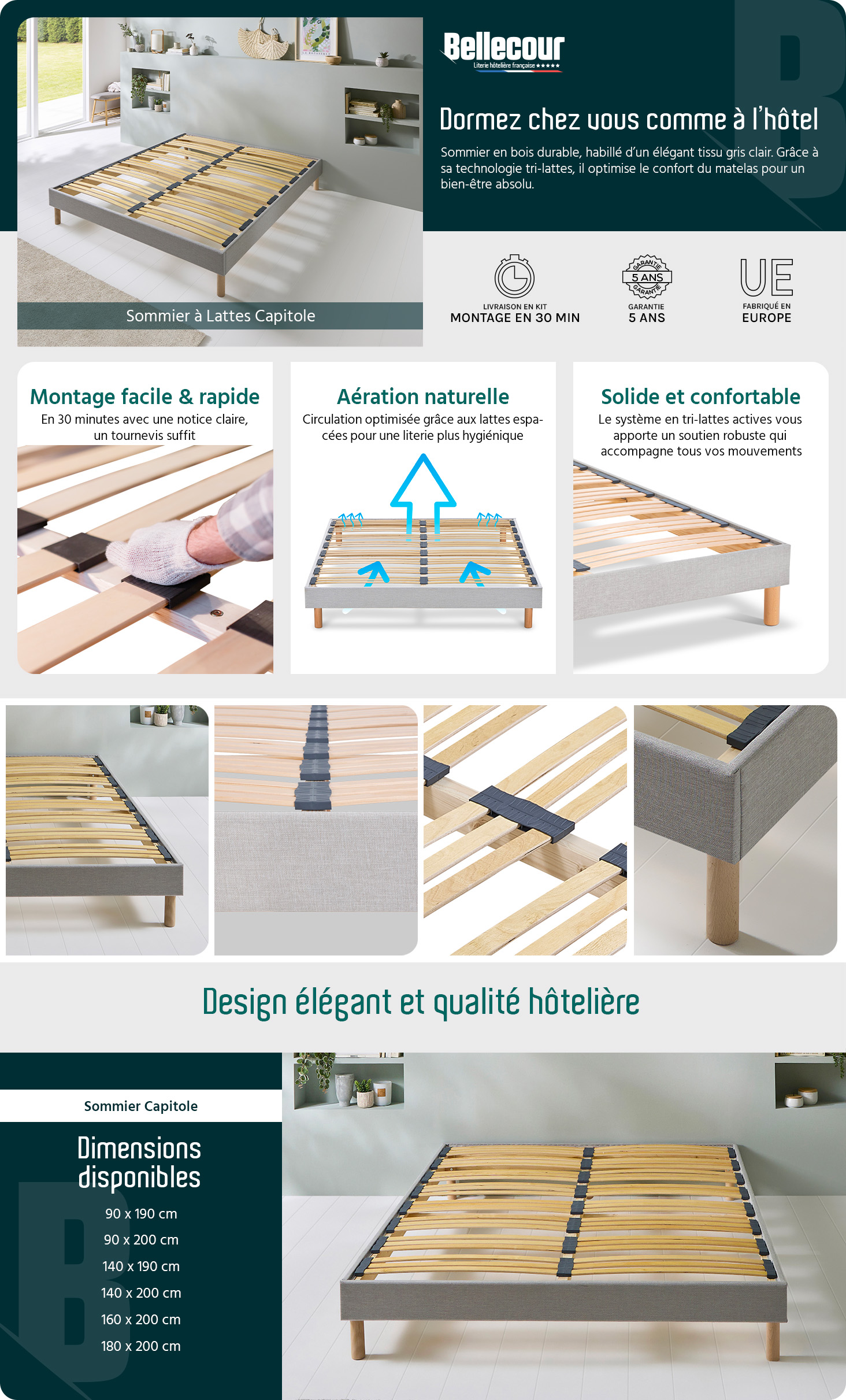 Type de sommier : parementé - suspension : tri-lattes - hauteur (pieds montés) : 30 cm - intégrable dans un cadre de lit