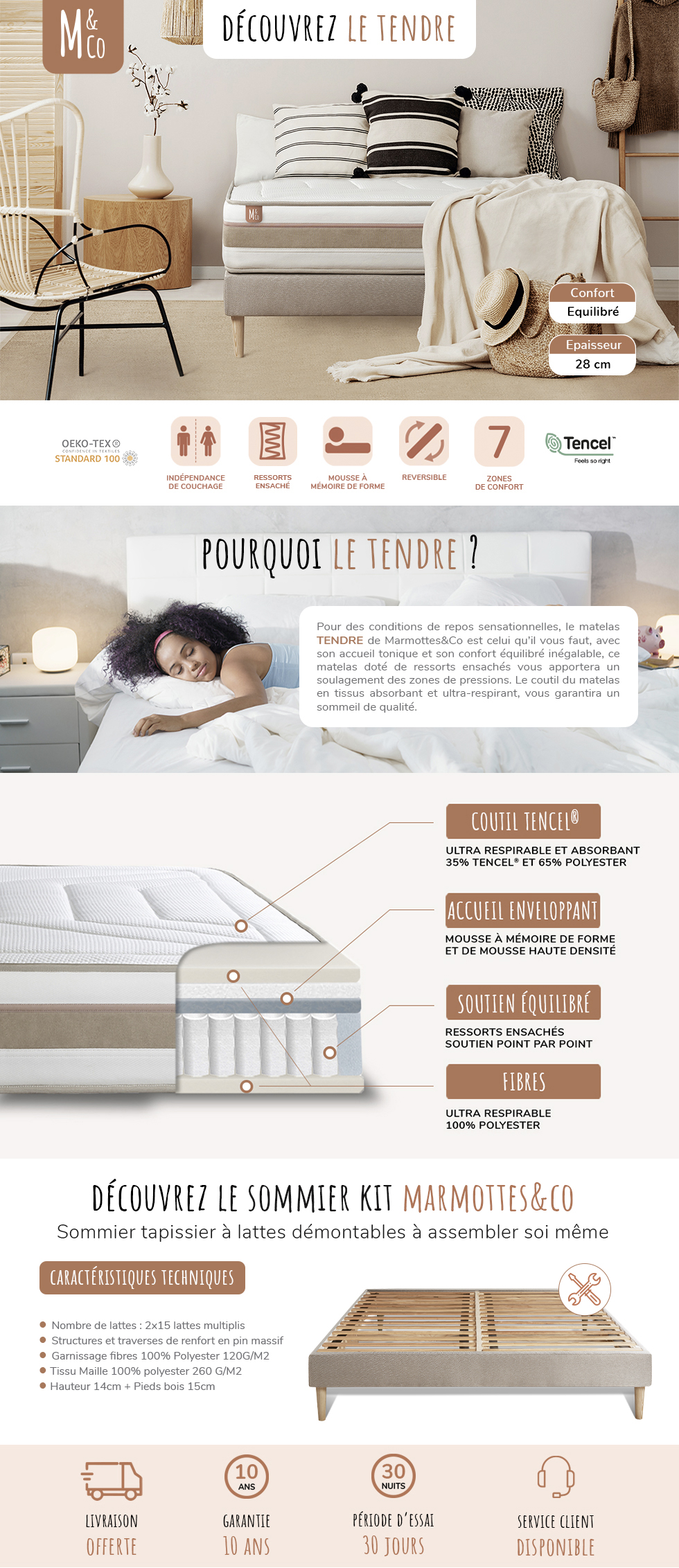 Le matelas TENDRE de Marmottes&Co allie avec brio un accueil enveloppant et les ressorts ensachés pour soulager les zones de pression. De plus, son coutil en tencel issu du bois d'eucalyptus est absorbant et ultra-respirant, il porte le label oeko-tex qui garantit l'absence de substances nocives pour la peau.