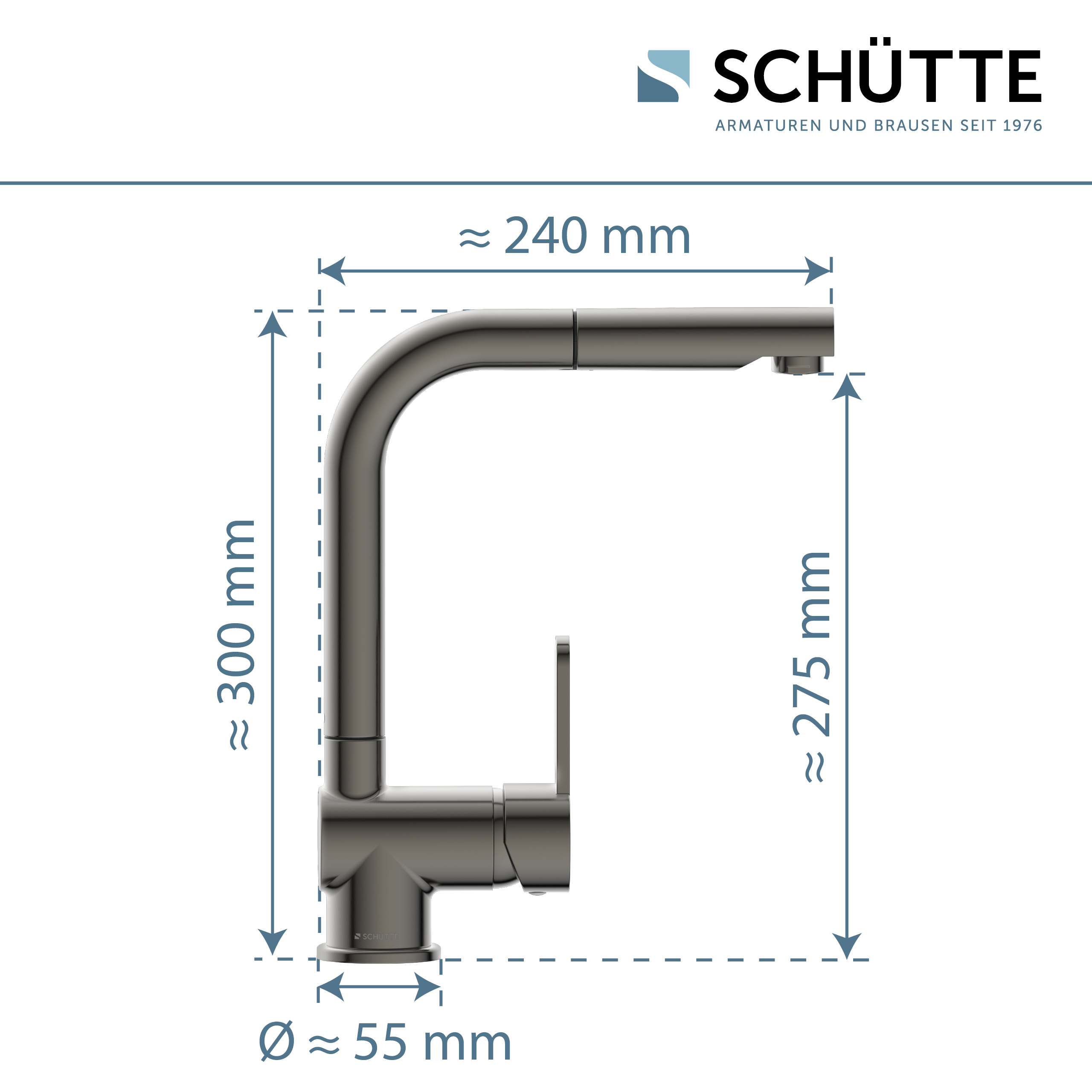 Le mitigeur LONDON Graphite mat de la marque SCHUTTE séduit par son design moderne et épuré, idéal pour une cuisine contemporaine.