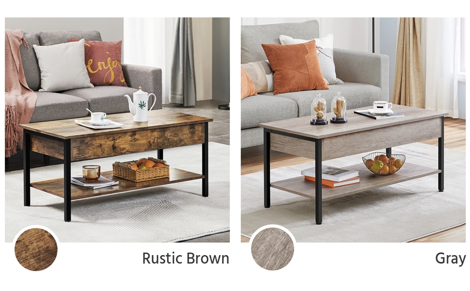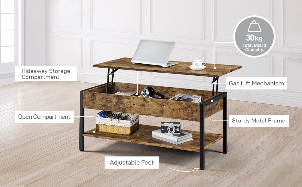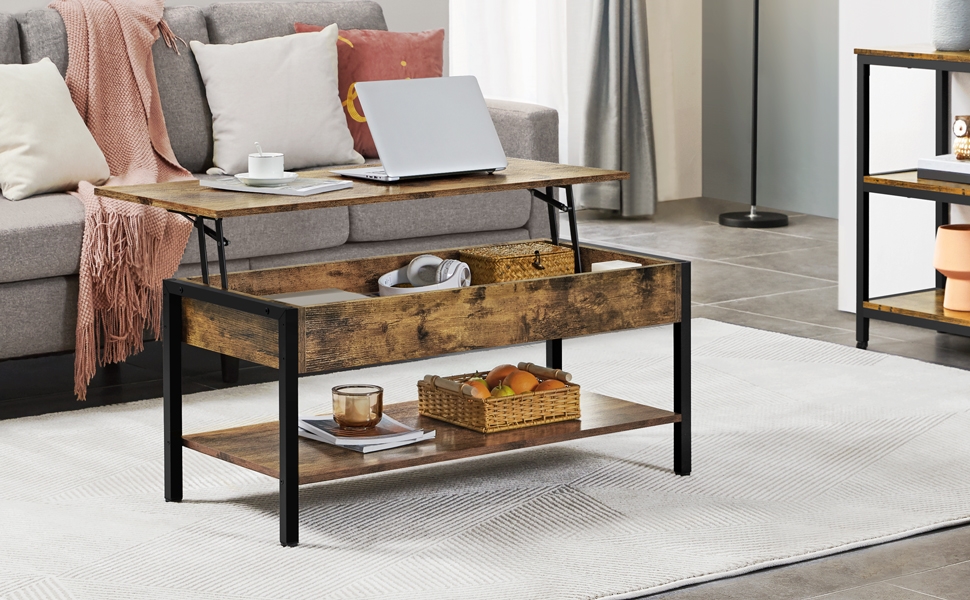 En levant le plateau supérieur, ce meuble va satisfaire vos besoins quotidiens : manger, travailler, discuter... Toutes ces activités seront réalisées dans cet espace convivial. Sous le plateau supérieur se trouve un grand compartiment qui va garder vos objets hors de regard. L'étagère dessous augmente son volume de stockage. Un atout de rangement, n'est-ce pas ? En plus, il dispose d'une structure solide et durable grâce aux matériaux sélectionnés. Son allure industrielle embellir votre intérieur, ajoutant une touche chaleureuse. Un rangement gain de place qu'il ne faut pas manquer.
