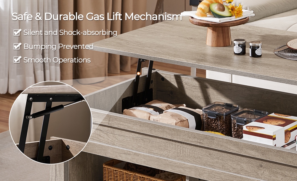 Cette table basse à plateau relevable est un ajout chic et pratique dont le plateau peut être facilement ajusté à une hauteur appropriée et confortable pour utiliser un ordinateur portable, écrire ou dîner assis sur le canapé. Sous le plateau, c'est un grand espace de rangement pour garder les objets utilisés quotidiennement à portée de main et propres. Deux étagères inférieures cloisonnées peuvent ranger des paniers de jouets ou mettre en valeur des objets décoratifs préférés. Recouver d'un revêtement imperméable et d'une quincaillerie en métal robuste, il est facile à nettoyer et la capacité de charge jusqu'à 55 kg au total, la table est solide et robuste pour votre usage quotidien.