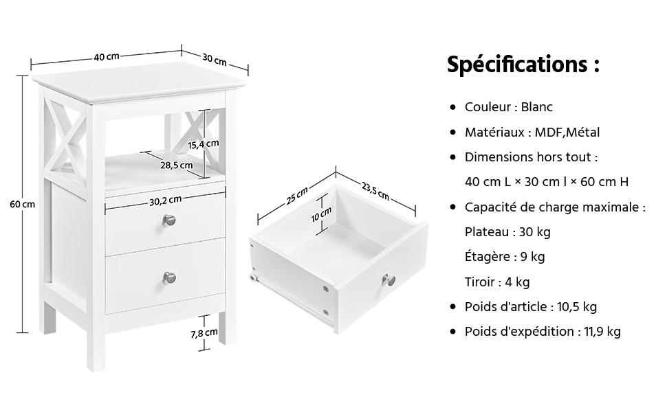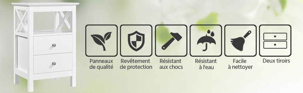 Stable et sûre, cette table de nuit est en planches MDF classées E1, pouvant supporter un poids élevé. Gain de place, elle permet de garder vos objets à portée de main et en ordre avec ses multiples rangements, soit un plateau supérieur, une étagère ouverte et deux tiroirs. Vous pouvez y mettre une lampe, des bibelots et des autres objets comme les clés. On apprécie son joli design. Ses côtés classiques en lattes X lui ajoute une note élégante. Polyvalente, cette table de chevet scandinave peut faire office de bout de canapé ou de table d'appoint. Vous pouvez la placer dans la chambre, le salon, le bureau, etc.