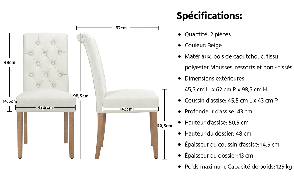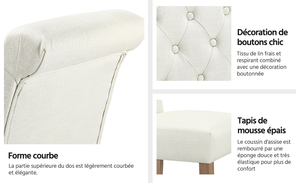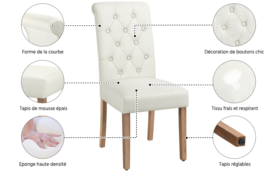 Haut dossier, lignes raffinés, et design classique, nos chaises de salle à manger qui allient bois et revêtement feront partie intégrante de la décoration intérieure de votre pièce. Avec revêtement texturé, les chaises de cuisine sont confortables grâce à leur assise moelleuse en éponge épaisse. Vous pouvez recevoir vos amis dans un confort agréable. Chaque chaise est assez robuste pour supporter 125 kg au maximum. Ses pieds en bois massif permettent une utilisation à long terme. On adore ses patins de pieds qui protègent votre sol et réduisent le bruit lors du déplacement. Vous pouvez les poser dans la cuisine, la salle de conférence, les hôtels, les restaurants, etc. Fonctionnelle, confortable et esthétique, une chaise déco incontournable à votre espace de vie. Profitez du bon moment à table avec notre produit.