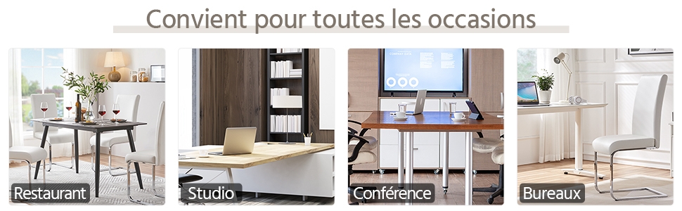 Confort, design, ergonomie… entre pratique et esthétique, nos chaises de salle à manger en fait combiner esthétisme et fonctionnalité. Les deux chaises s'associent les deux éléments de déco : métal et similicuir, ajoutant une touche stylée et moderne à votre maison. Le design s'harmonise bien avec de multiples pièces : la salle de conférence, la cuisine, le salon, le bureau, etc. Grâce à une armature en métal galvanisé, chaque chaise de cuisine est assez robuste pour supporter une charge de 135 kg au plus. De plus, le revêtement en similicuir nécessite peu d'entretien. Les chaises rembourrées de mousse de haute densité, le haut dossier un peu incurvé, les designs soigneux valorisent le côté ergonomique. Pour être assis confortablement, munissez-vous de ce modèle à votre séjour.