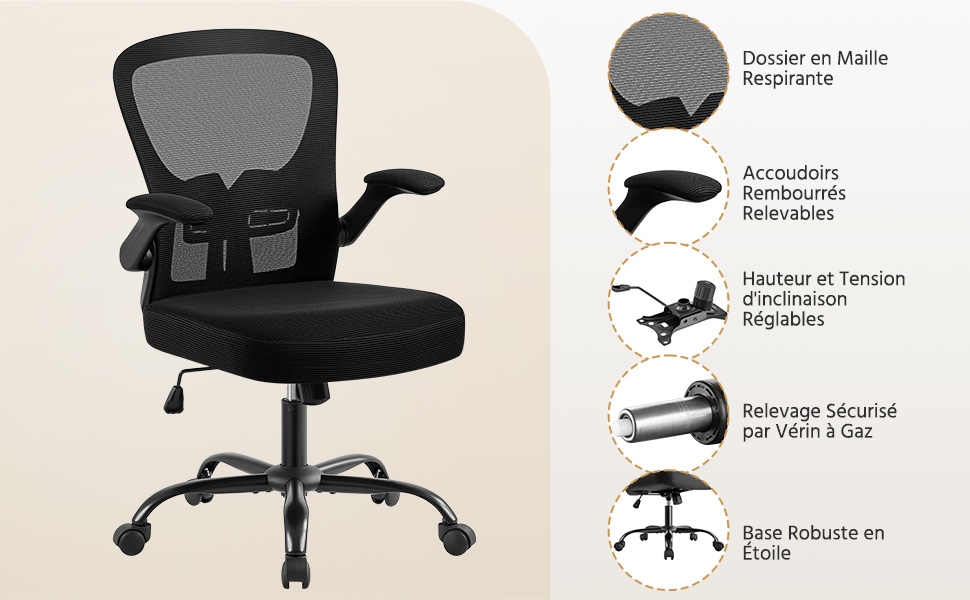 2. Accoudoirs relevables: Pour plus de liberté de mouvement, vous pouvez relever les accoudoirs réglables du fauteuil d'ordinateur à 90°. Lorsqu'il n'est pas utilisé, cette chaise avec accoudoirs relevables se glisse sous le bureau pour gain de place