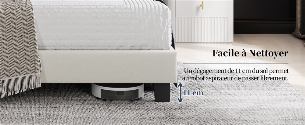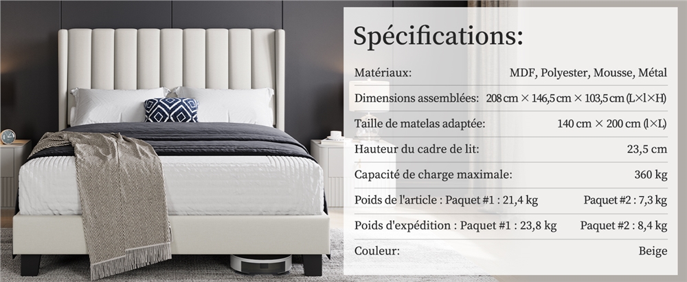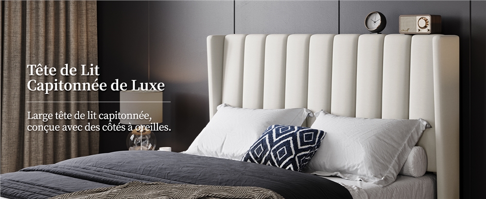 3. Tête de lit design ailé: Enveloppée de tissu respirant imitant le lin et rembourrée de mousse haute densité, la tête de lit capitonnée offre un confort exceptionnel pour se détendre en toute sérénité. Son design à oreilles évite le glissement du matelas