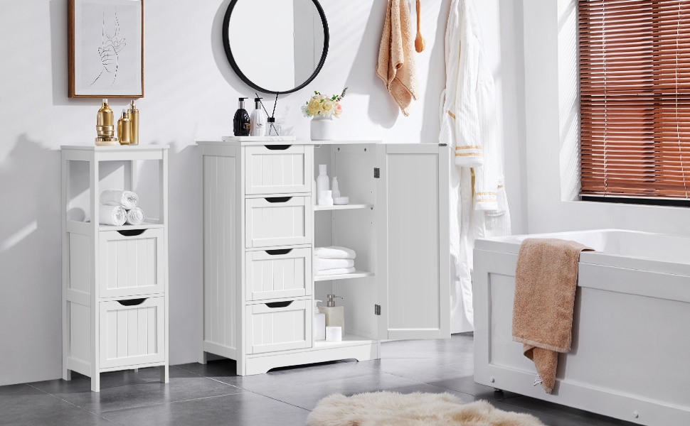 5. Grand espace de rangement : Les 4 grands tiroirs du buffet commode conservent des objets hors de vue. Le placard, avec une étagère réglable en hauteur, peut contenir des articles de différentes tailles telles que cosmétiques, papier toilettes, shampoing, etc