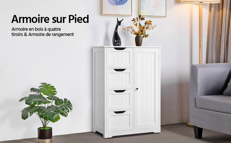 Envie de rendre votre pièce belle et organisée ? Découvrez cette armoire de salle de bain qui va rafraîchir votre intérieur. Cette armoire sur pied comprend 4 tiroirs à poignée encastrée et 1 placard spacieux avec une étagère réglable en hauteur. Un meuble fonctionnel qui va satisfaire vos besoins de rangement. Doté d'un revêtement résistant à l'eau, cette armoire en bois MDF est un mobilier idéal pour la salle de bains. Elle peut aussi s'installer dans le salon ou la chambre. Son design aux lignes épurées s'adapte à une variété des styles décoratifs. Procurez-vous ce buffet avec rangement gain de place.