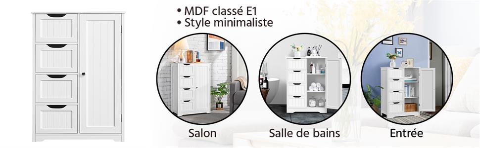 4. Gain de place : Mesurant 66 cm L × 35 cm l × 90 cm H, ce meuble salle de bain rangement est composé de 4 tiroirs et 1 placard avec étagère réglable. Un mobilier peu encombrant, idéal pour les petits espaces