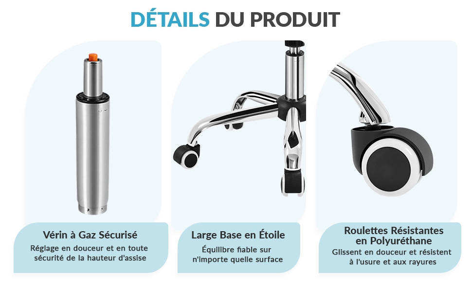 4.Mobilité Flexible, Hauteur Réglable : Doté de 5 roulettes résistantes en polyuréthane, le siège de bureau permet des déplacements fluides et silencieux sans rayer le sol. La hauteur d'assise est ajustable de 47,5 cm à 57 cm pour s'adapter à votre bureau