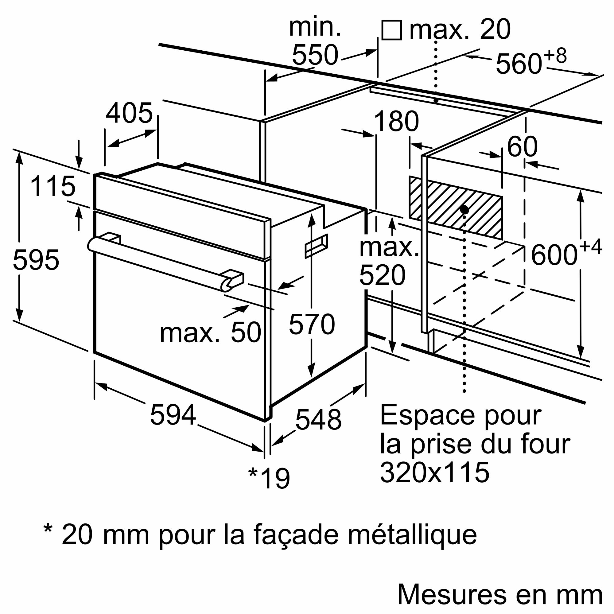 Les dimensions de ce four (largeur de 59,4 cm, hauteur de 59,5 cm, profondeur de 54,8 cm) permettent une installation aisée dans la plupart des espaces encastrables.