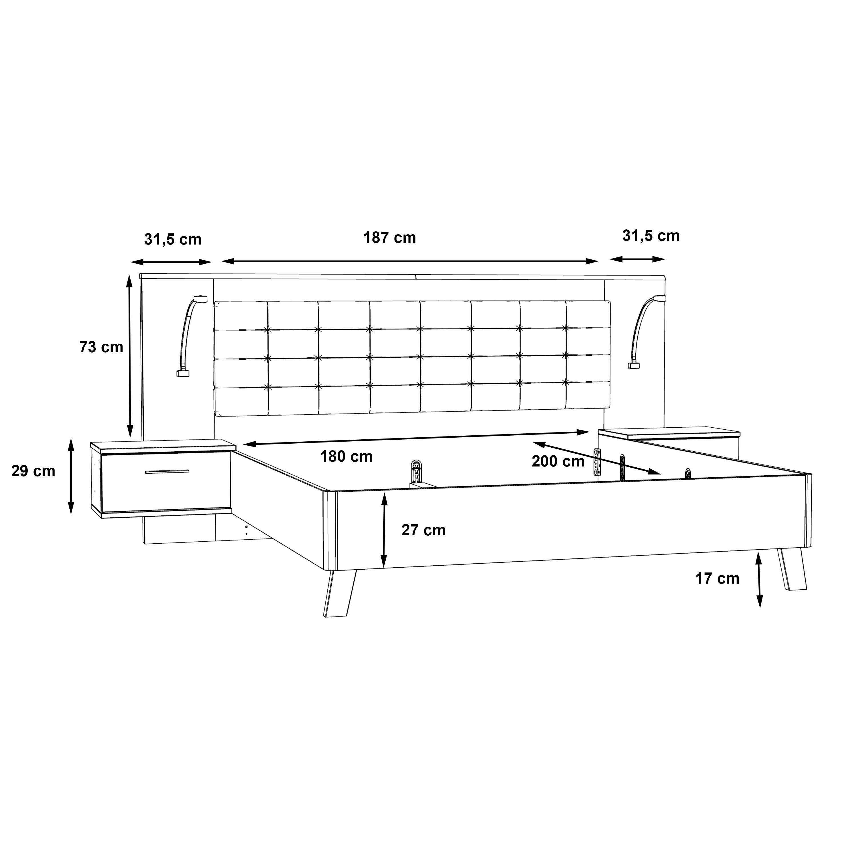 Avec ses dimensions généreuses de 180 par 200 cm, ce lit est idéal pour les grandes chambres, apportant un espace de sommeil spacieux et agréable.