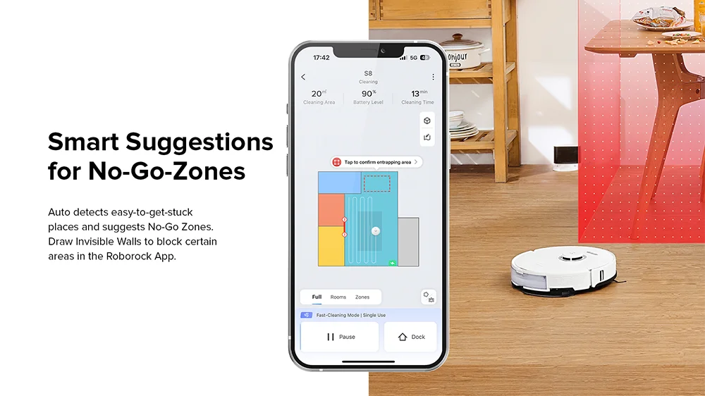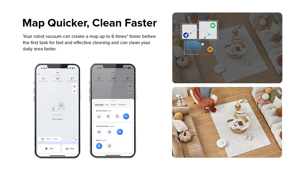 5 Système de navigation de précision: Le système de navigation de précision crée des cartes détaillées pour trouver un itinéraire optimal pour un nettoyage plus rapide. Le robot de nettoyage S8 peut détecter automatiquement les zones bloquées et dessiner des murs invisibles dans l'application Roborock pour configurer les zones interdites.