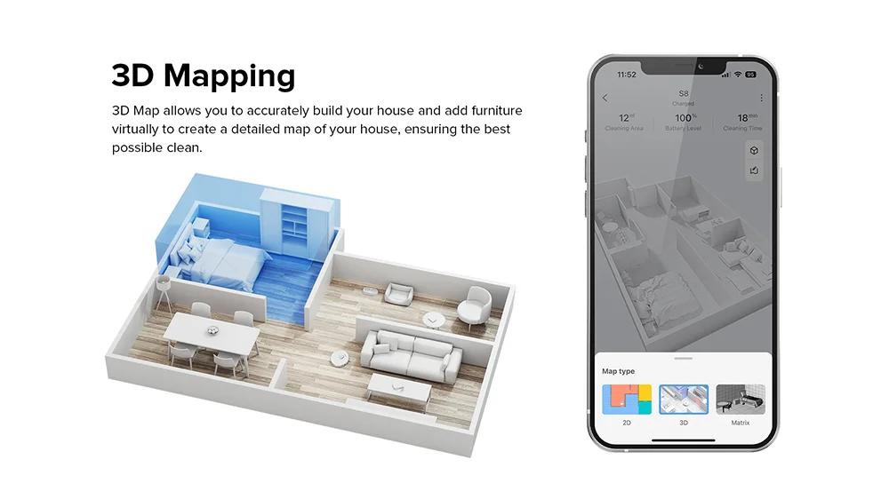 4 Très intelligent: Équipé d'une détection d'obstacle 3D avec lumière structurée-un processus qui utilise un motif projeté sur une scène et utilise des déformations de motif pour détecter avec précision les obstacles afin que le robot vadrouille à aspiration S8 pense plus intelligemment et fonctionne plus rapidement et plus facile que jamais.