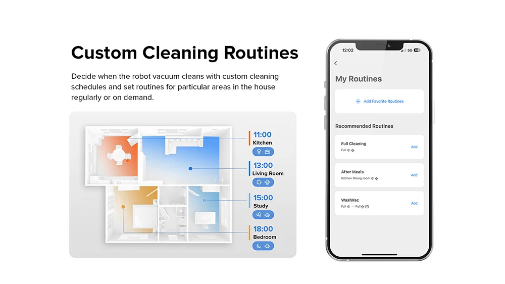 6 routines personnalisées:Des routines de nettoyage personnalisées permettent au robot de vadrouille d'aspiration de définir des routines de nettoyage régulières ou si nécessaire pour certaines zones de la maison. Lorsque le nettoyage est terminé ou que la batterie est faible, il retourne automatiquement à la station de charge.