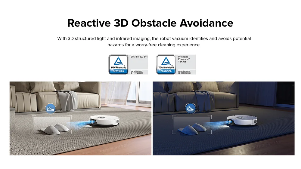 Grâce à la lumière structurée en 3D et à l'imagerie infrarouge,le robot aspirateur peut identifier et éviter les dangers