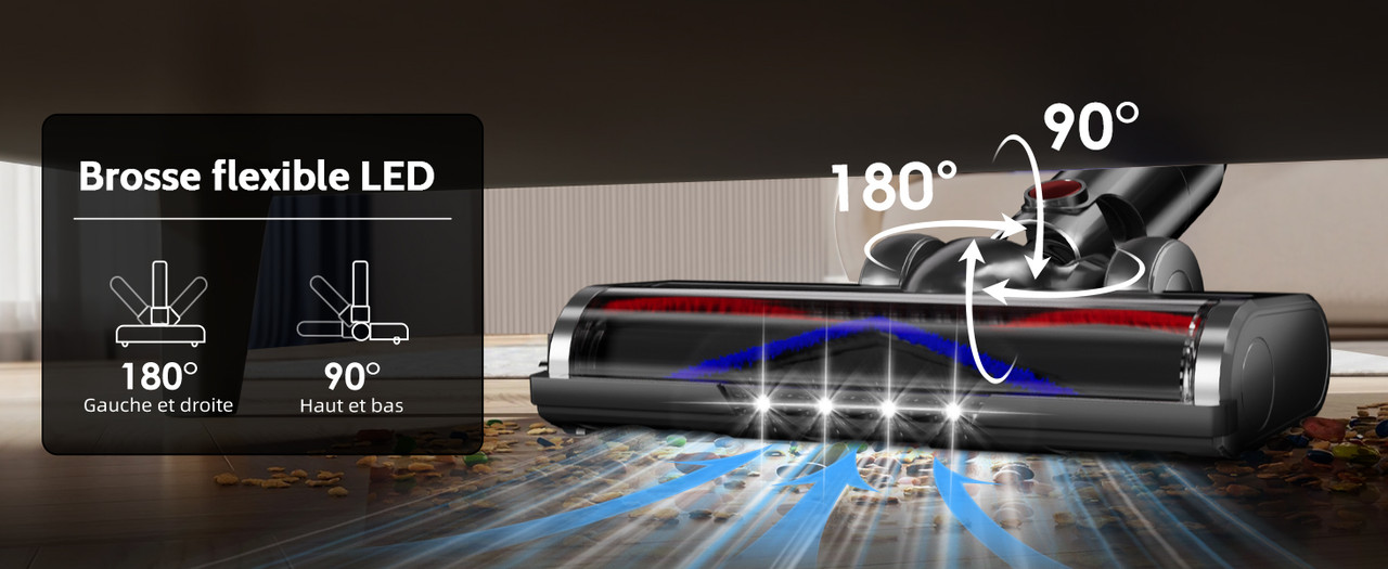 - Tête de brosse en V et éclairage LED pour un nettoyage optimal