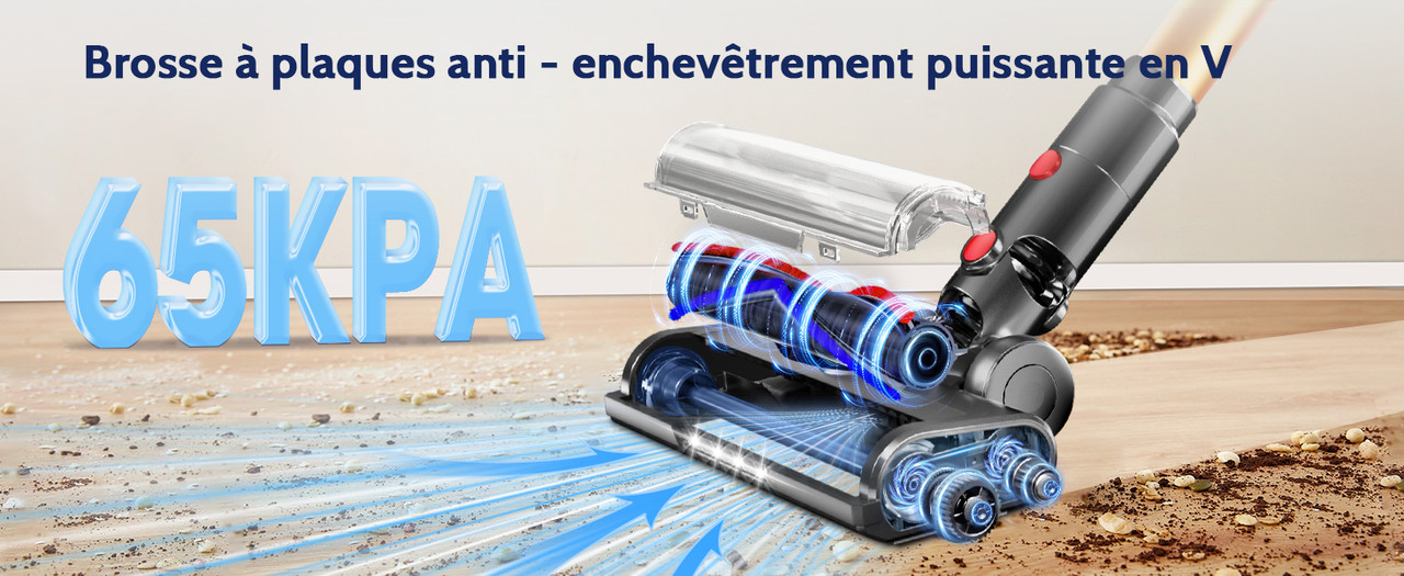 Cet aspirateur balai est équipé d'une tête de brosse au grand design en V, réduisant au maximum le risque d'enchevêtrement des cheveux, ce qui rend l'aspirateur sans fil plus fluide lors du nettoyage des tapis et des sols. aspirateur sans sac est également doté d'un éclairage LED écoénergétique, vous permettant de voir plus clairement la poussière dans les coins sombres. La tête de brosse dispose d'une capacité d'ajustement avant-arrière à 90° et latéral à 180°, vous permettant de nettoyer facilement des pieds de table aux coins sombres difficiles d'accès. Optimisez votre expérience de nettoyage avec notre aspirateur, qui allie performance, innovation et praticité pour un intérieur impeccable.