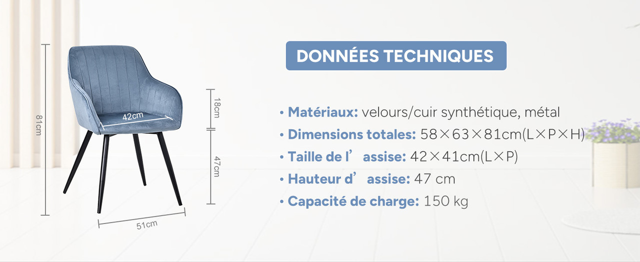 Caractéristiques du produit : La surface en cuir est imperméable et résistante aux taches, facile d'entretien et embellit votre intérieur. Elle s'adapte aux styles de décoration modernes, légers et luxueux, entre autres. L'intérieur est garni d'éponge épaisse haute densité, résistante et durable. L'assise large (42 x 41 cm) convient à toutes les morphologies et offre un confort optimal, que ce soit pour dîner ou travailler.