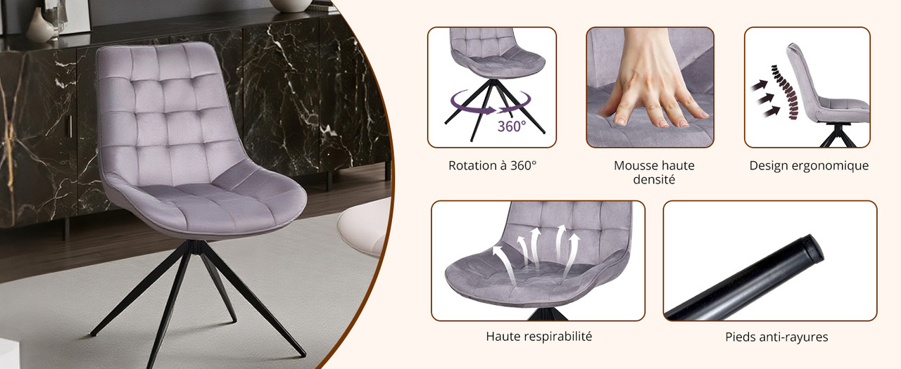 Cette chaise de salle à manger possède des pieds et une base en métal massif de haute qualité, solides et durables, pouvant supporter jusqu’à 150 kg. Les embouts des pieds protègent le sol, qu’il s’agisse de carrelage, moquette ou parquet, tout en assurant stabilité, antidérapance, résistance aux rayures et silence lors des déplacements.