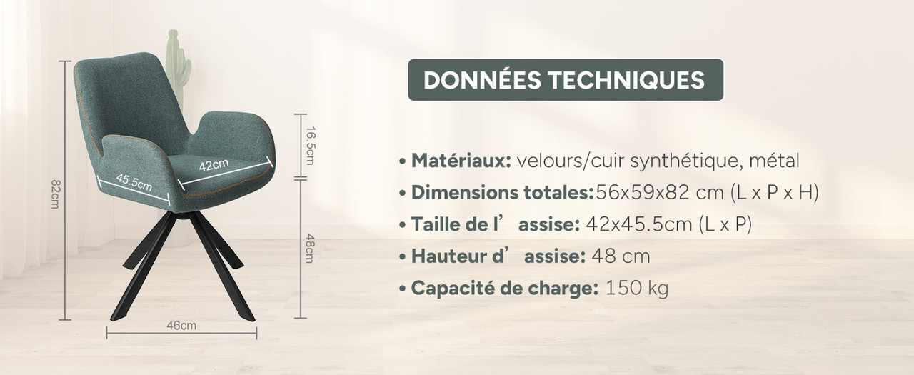 Caractéristiques du produit : La surface en cuir est imperméable et résistante aux taches, facile d'entretien et embellit votre intérieur. Elle s'adapte aux styles de décoration modernes, légers et luxueux, entre autres. L'intérieur est garni d'éponge épaisse haute densité, résistante et durable. L'assise large (42 x 45.5 cm) convient à toutes les morphologies et offre un confort optimal, que ce soit pour dîner ou travailler.