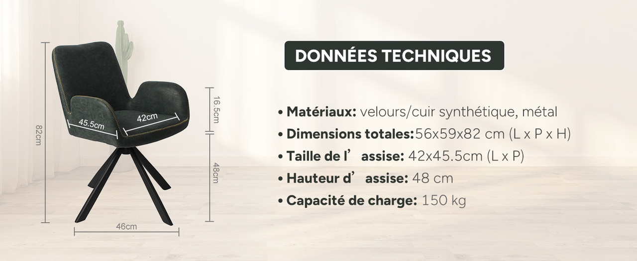 Caractéristiques du produit : La surface en cuir est imperméable et résistante aux taches, facile d'entretien et embellit votre intérieur. Elle s'adapte aux styles de décoration modernes, légers et luxueux, entre autres. L'intérieur est garni d'éponge épaisse haute densité, résistante et durable. L'assise large (42 x 45.5 cm) convient à toutes les morphologies et offre un confort optimal, que ce soit pour dîner ou travailler.
