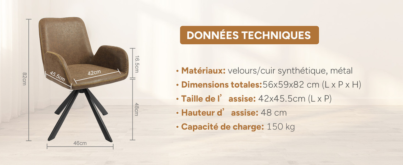 Caractéristiques du produit : La surface en cuir est imperméable et résistante aux taches, facile d'entretien et embellit votre intérieur. Elle s'adapte aux styles de décoration modernes, légers et luxueux, entre autres. L'intérieur est garni d'éponge épaisse haute densité, résistante et durable. L'assise large (42 x 45.5 cm) convient à toutes les morphologies et offre un confort optimal, que ce soit pour dîner ou travailler.
