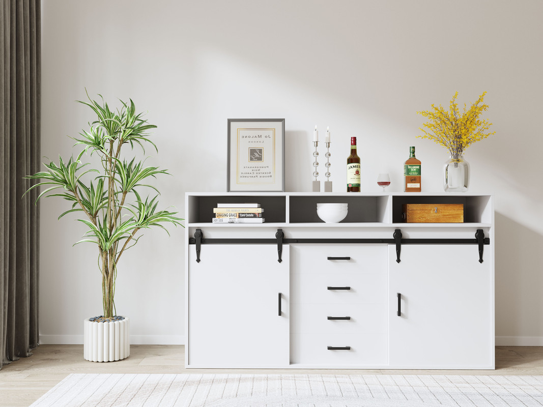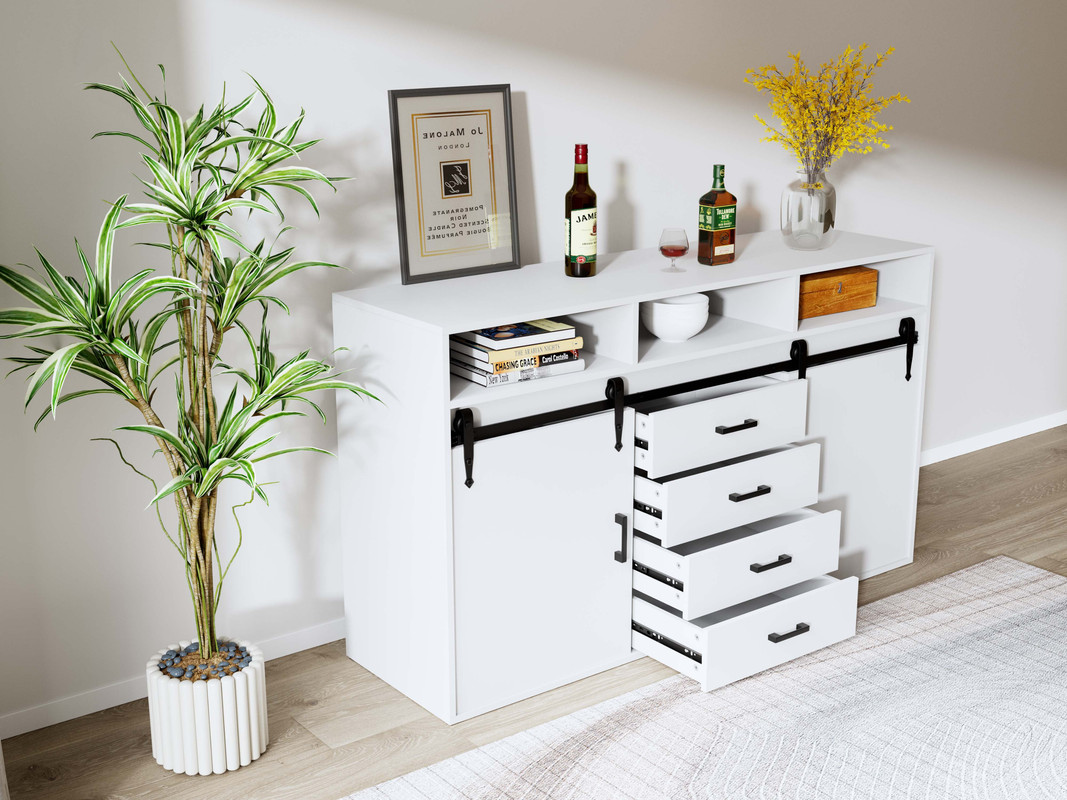 Espace de rangement polyvalent : avec 2 portes coulissantes (étagères réglables), 4 tiroirs spacieux et 3 compartiments ouverts – idéal pour la vaisselle, les dossiers ou la décoration.