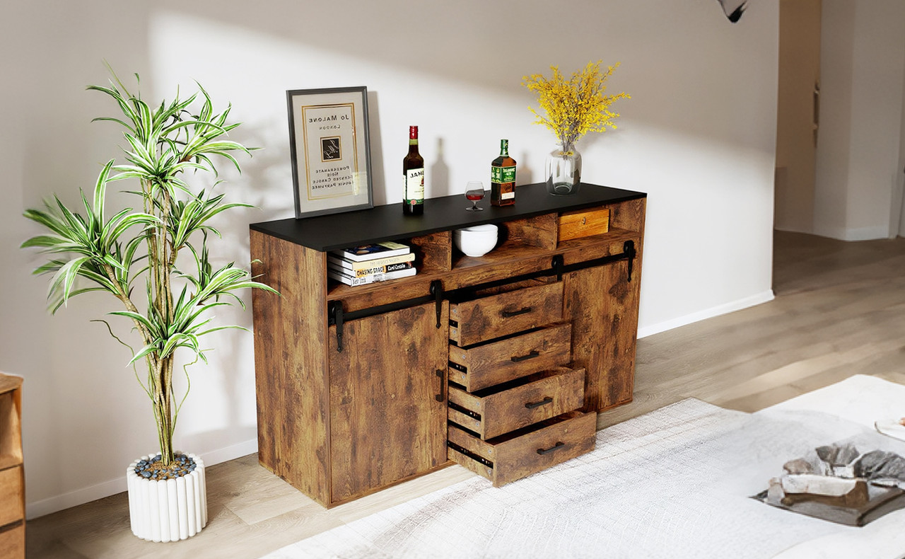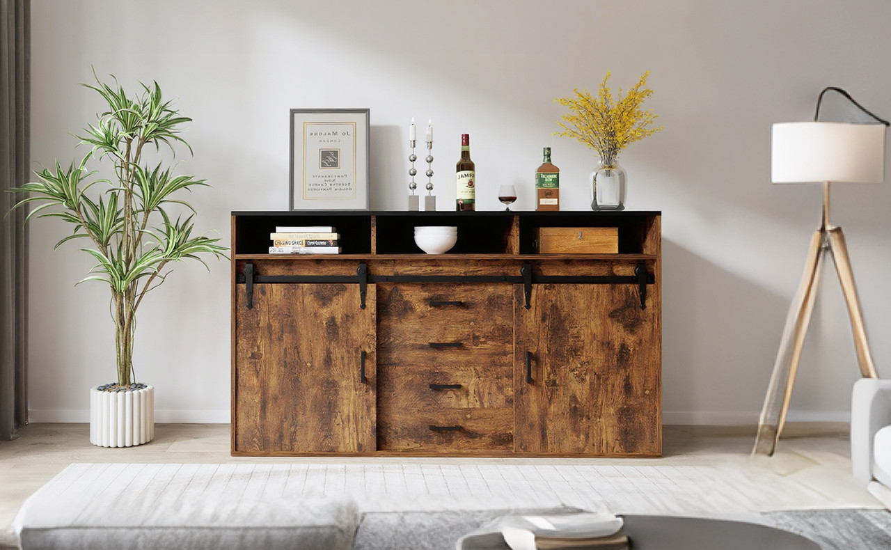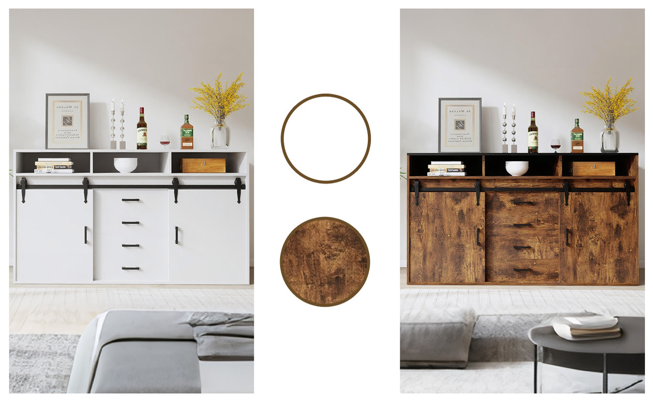 Espace de rangement polyvalent : avec 2 portes coulissantes (étagères réglables), 4 tiroirs spacieux et 3 compartiments ouverts – idéal pour la vaisselle, les dossiers ou la décoration.