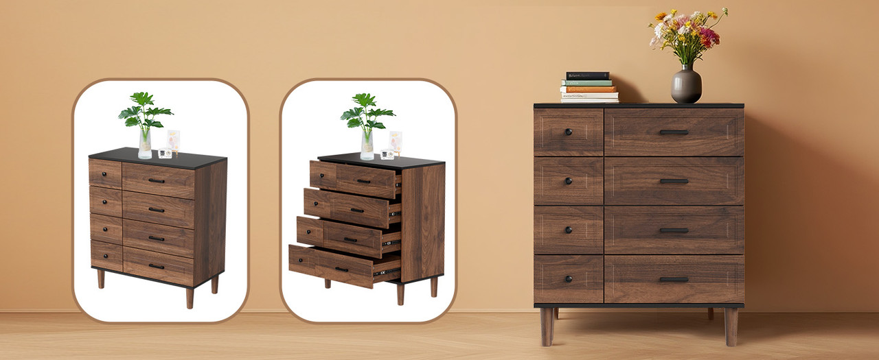 Équipée de 8 tiroirs spacieux, elle offre un grand espace de rangement pour vos vêtements, livres ou objets du quotidien.