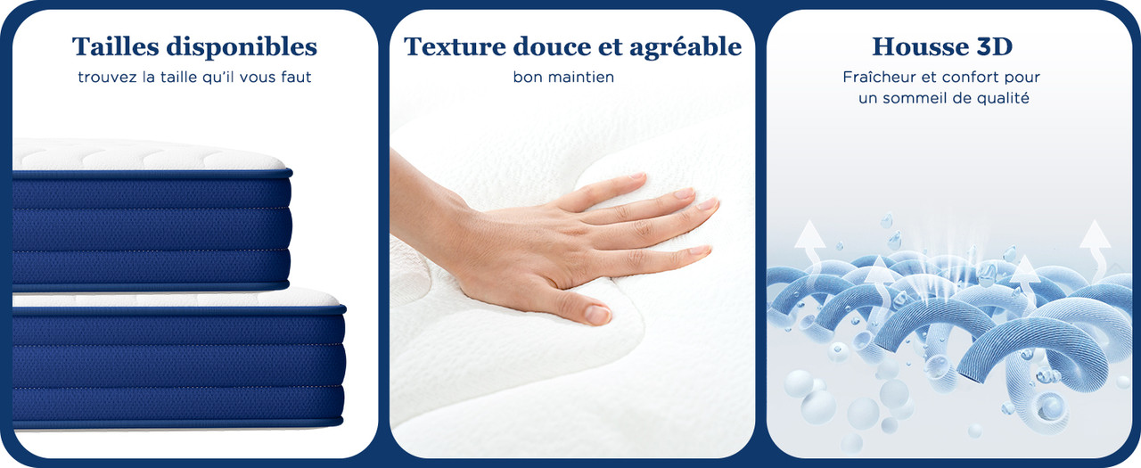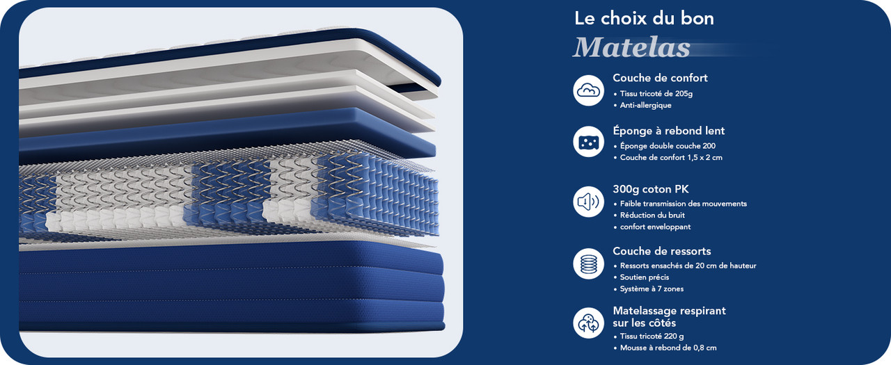 Multi-couches + 7 zones + H3 = confort, stabilité et durabilité.