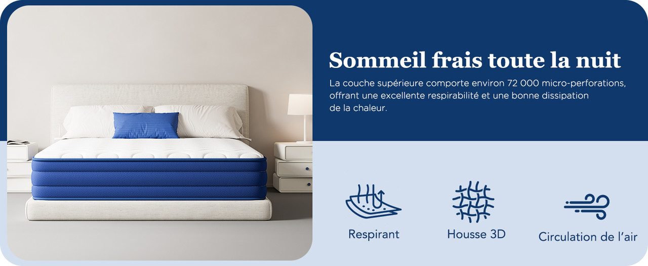 Tissu doux, rembourrage confortable et membrane respirante pour un environnement de sommeil frais et sec.