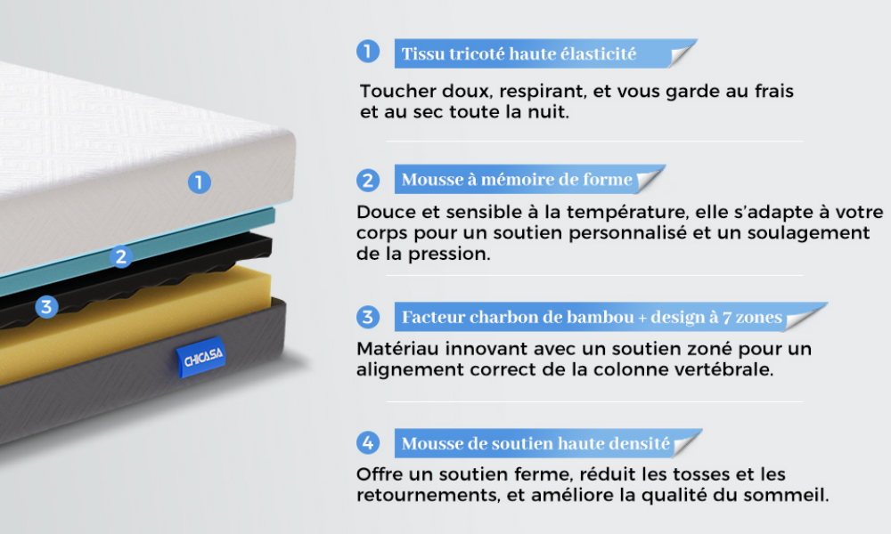 Le matelas CHICASA offre un soutien sur mesure, pour un confort maximal, quel que soit votre type de sommeil ou vos préférences.