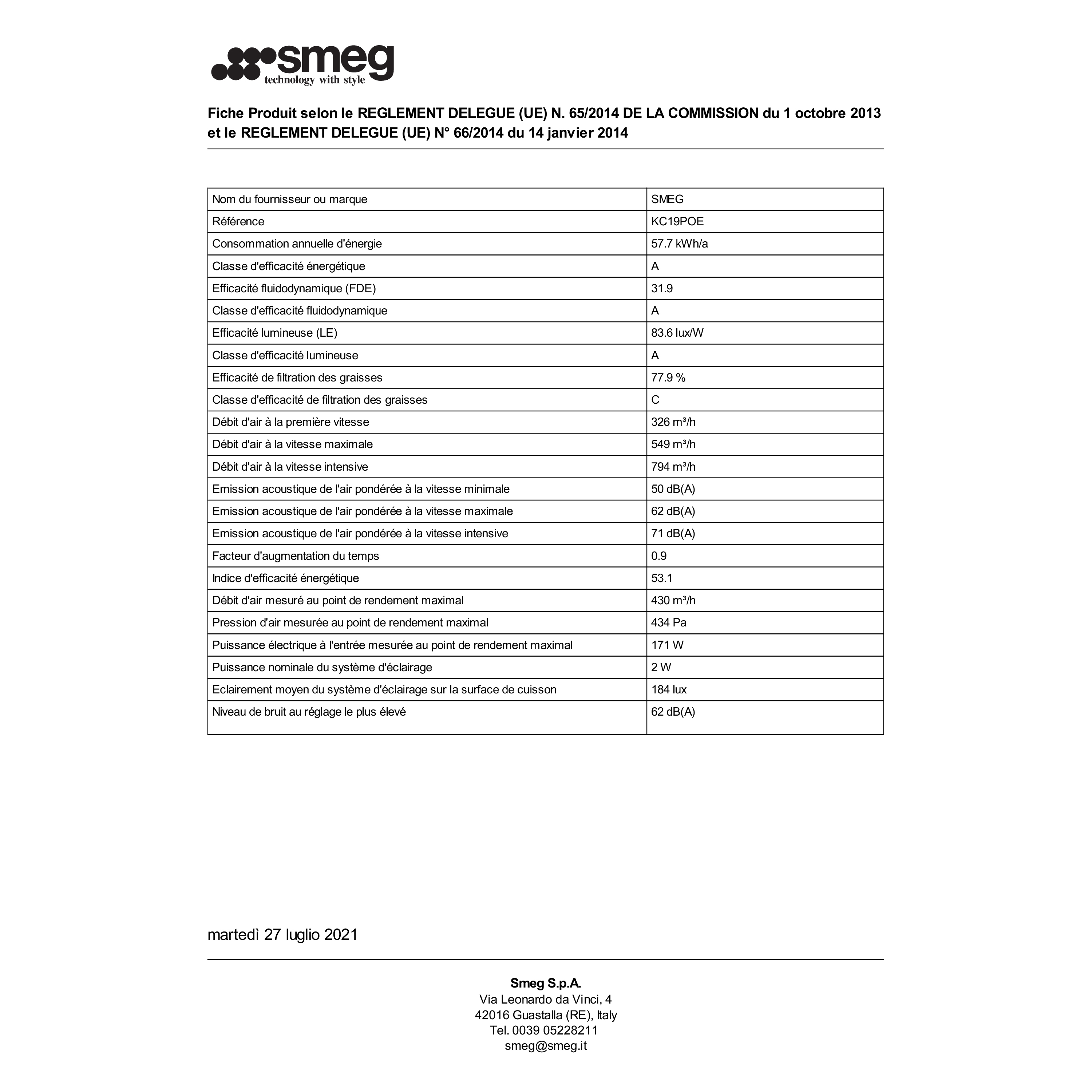 La hotte décorative SMEG KC19POE 90 cm se distingue par sa performance énergétique de classe A, garantissant une efficacité optimale tout en économisant de l'énergie.