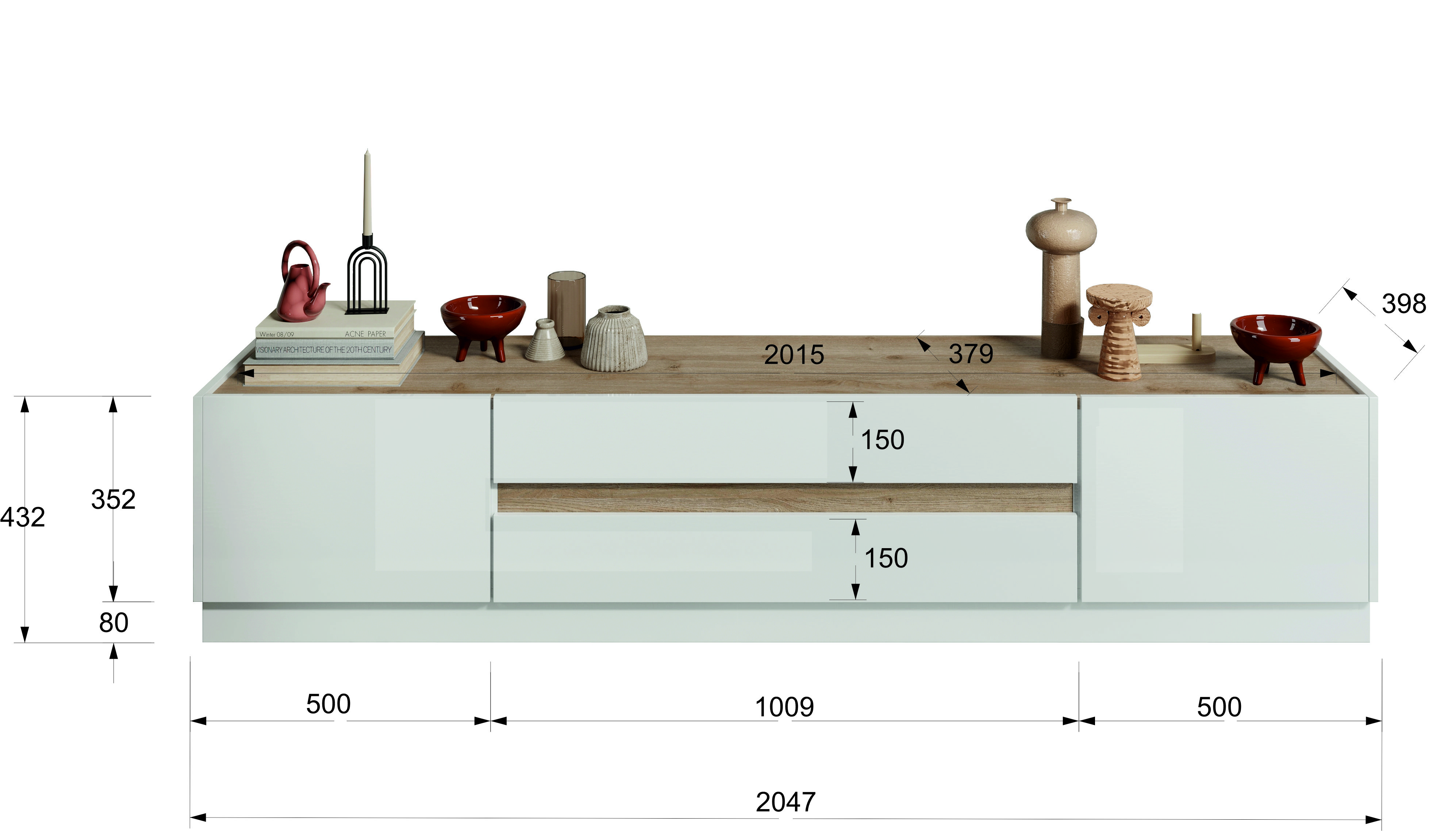 Le Meuble TV 2 portes 2 tiroirs MAZARIN imitation chêne et blanc brillant s'intègre parfaitement dans un salon moderne grâce à son design épuré et ses finitions en blanc laqué brillant.