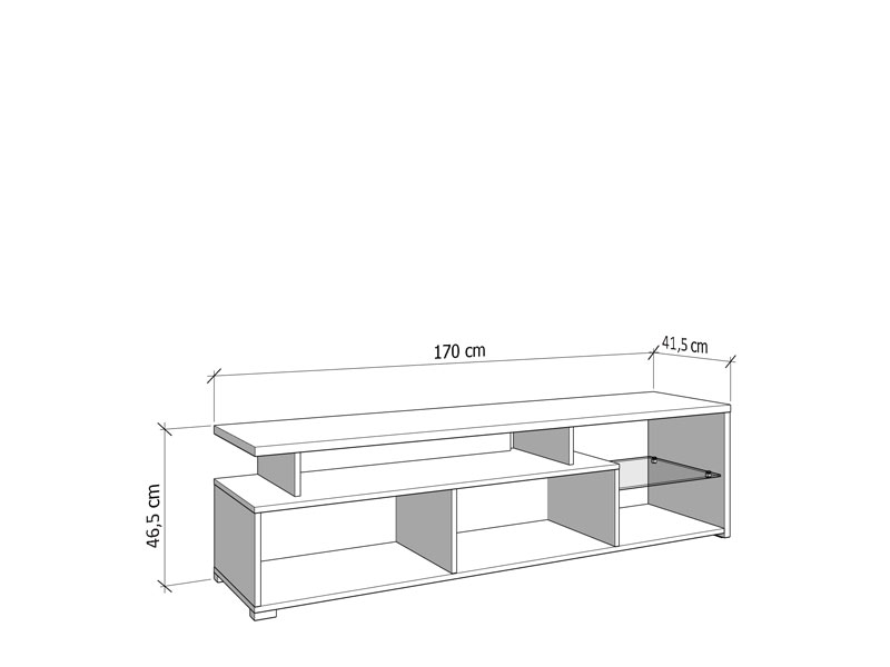 Ce meuble TV imitation chêne et blanc dispose de plusieurs espaces de rangement. La partie principale est composée de deux niches et refermée par une porte à abattant. Pratiques, les étagères du meuble TV n'ont pas de fond pour faciliter le passage des câbles. Ce meuble TV de 170 cm de long peut accueillir une télévision de maximum 40 kg.