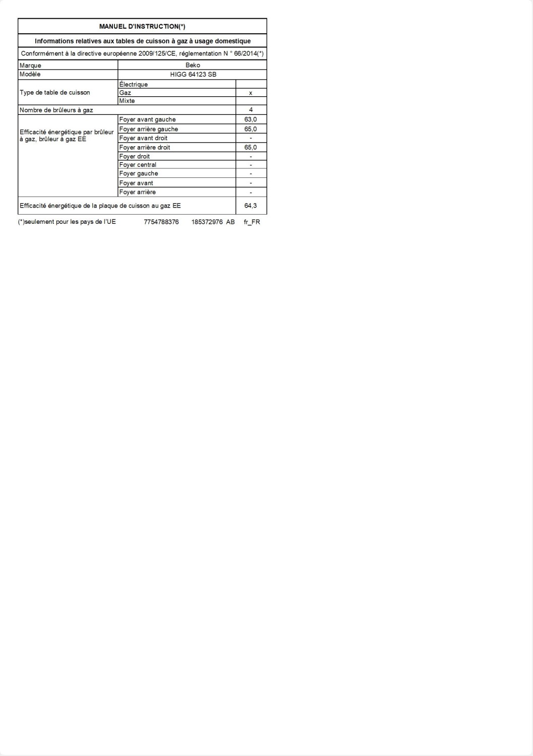 Higg64123sb - table de cuisson à gaz higg64123sb beko. Toutes nos tables de cuisson, y compris les modèles de 70 cm, sont à encastrement standard afin de faciliter votre installation. Pas besoin de nouvelle découpe en cas de remplacement d'un modèle 60cm. Faciles d'utilisation et très précises, toutes nos tables de cuisson au gaz sont équipées de l'allumage intégré et disposent de la sécurité thermocouple qui arrête l'alimentation de gaz losrque la flamme s'éteint. Grâce à l'allumage intégré, les brûleurs des foyers gaz se mettent en marche en un seul geste. Si la flamme s'éteint accidentellement à cause d'un courant d'air ou par un liquide qui déborde, l'arrivée de gaz est automatiquement coupée pour prévenir tout accident. Beko s'engage à conserver les pièces détachées de cet appareil pendant 11 ans, à compter de la première date d'achat par les consommateurs. - type : table de cuisson gaz. Type de plaque : gaz. Type d'encastrement : a recouvrement plan de travail. Energie : gaz. Hotte intégrée : non. Nbre foyer(s) : 4. Touche(s) sensitive(s) : non. Type de commande(s) : manettes. Position des commandes : latérale. Type d'allumage : electronique intégré. Zone de cuisson modulable (flex) : non. Foyer le + puissant (w) : 2900. Matière de la surface : email. Connecté : non. Sécurité gaz : oui. Puissance de raccordement (w) : 7900. Hauteur (cm) : 4.4. Largeur (cm) : 61. Profondeur (cm) : 51. Encastrement h x l x p (cm) : 56 x 49. Couleur : noir. Finition / nuance : métal. Poids (kg) : 7.5.