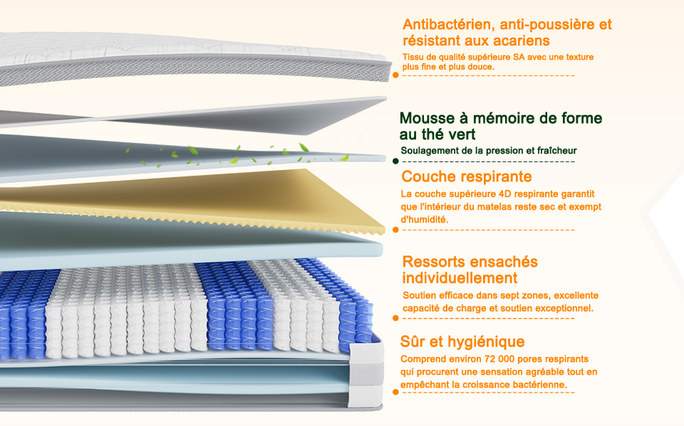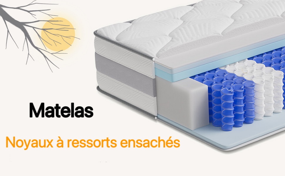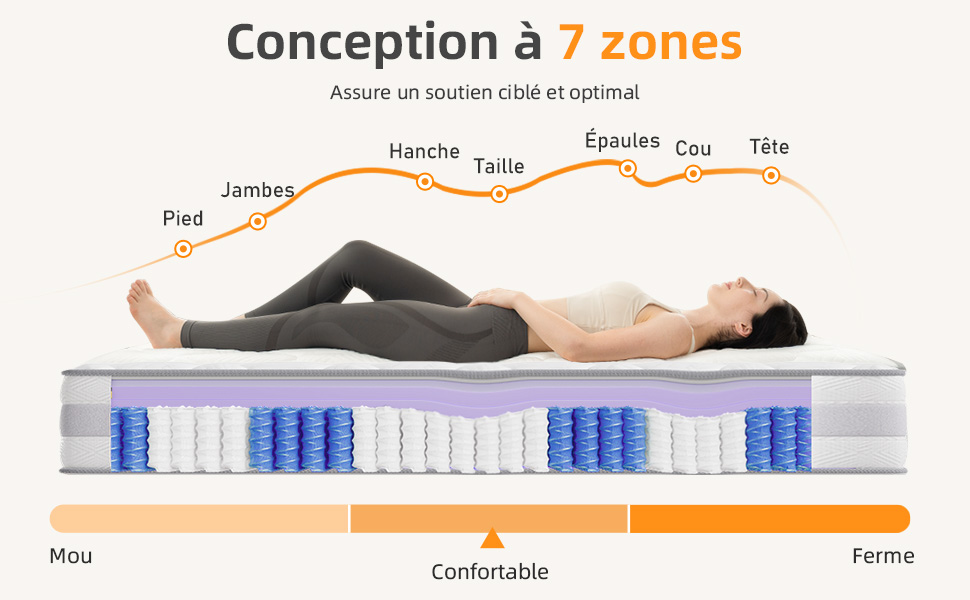 Le coeur du matelas repose sur un système à ressorts ensachés réparti en 7 zones ergonomiques, conçues pour soutenir tête, épaules, lombaires, hanches, jambes et pieds, garantissant :