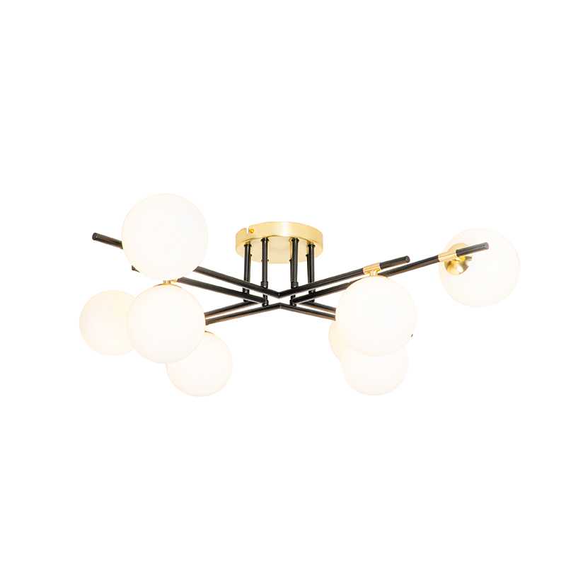 QAZQA Plafonnier Noir Avec Or Et Verre Opale 8 Lumières - Lynn